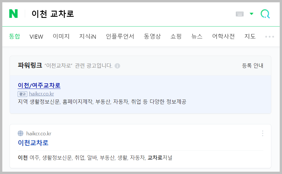 네이버에서 간단하게 이천교차로라고 입력을 하면 어렵지 않게 원하는 웹페이지를 찾을 수 있습니다. 이러한 검색은 네이버 다음 거의 비슷합니다. 보여지는 형식이 조금 다를 뿐입니다.