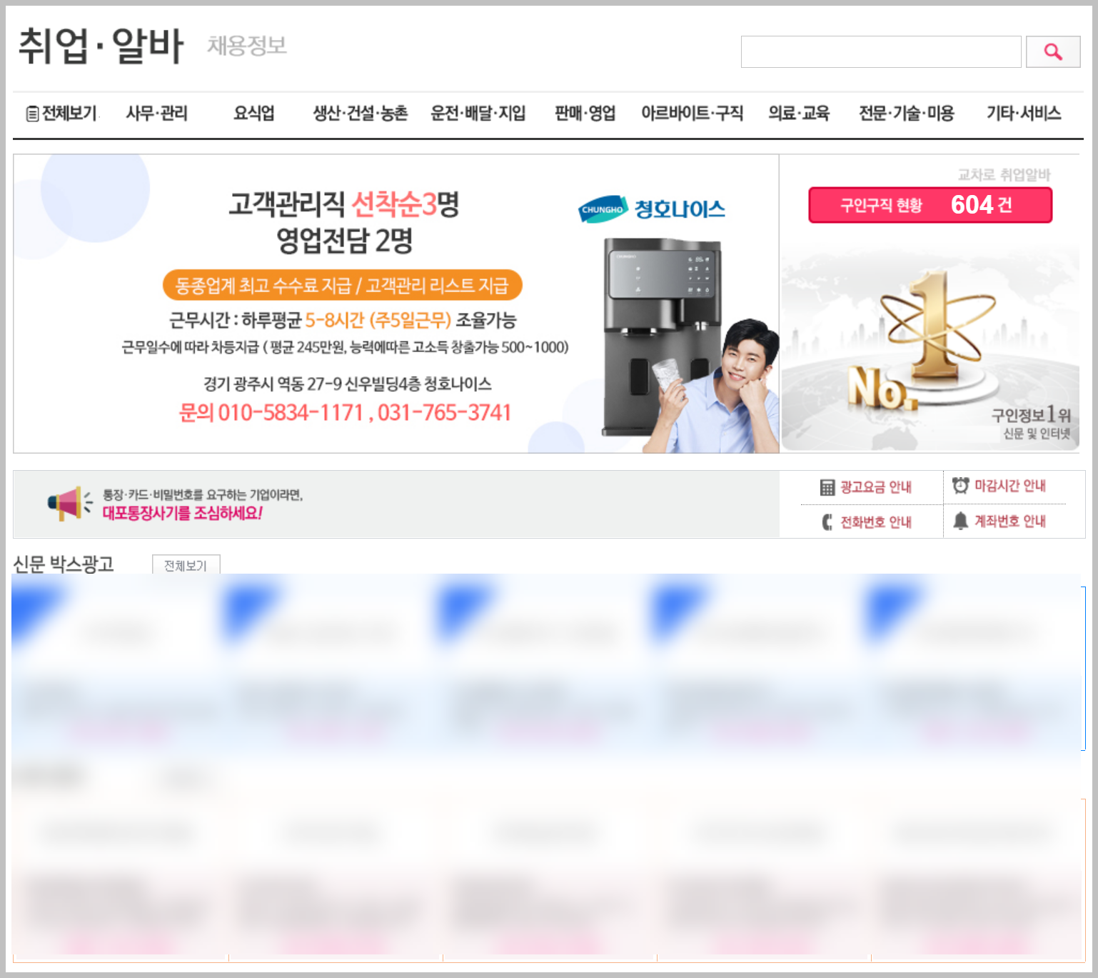 구인구직 페이지로 들어가면 위와 같은 화면을 볼수 있습니다. 신문의 줄광고, 박스광고를 여기에 올려놓을 수 있습니다. 신문에 광고를 넣으면 홈페이지에 광고가 들어가는 방식이라고 생각이 듭니다.
