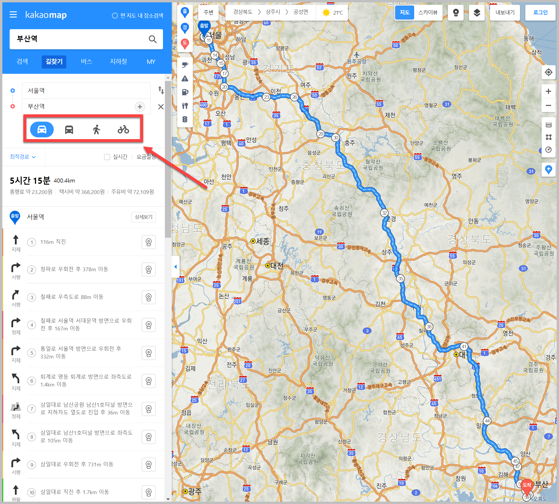 위와 같이 화면이 전환이 되면서 서울에서 부산으로 '자동차'로 가는 방법에 대해서 설명을 해줍니다. 하지만 모든 사람이 자동차로 갈 수는 없고 대중교통으로 갈 수도 있기 떄문에 위의 화살표에 있는 옵션을 적절하게 선택을 해주시면됩니다.