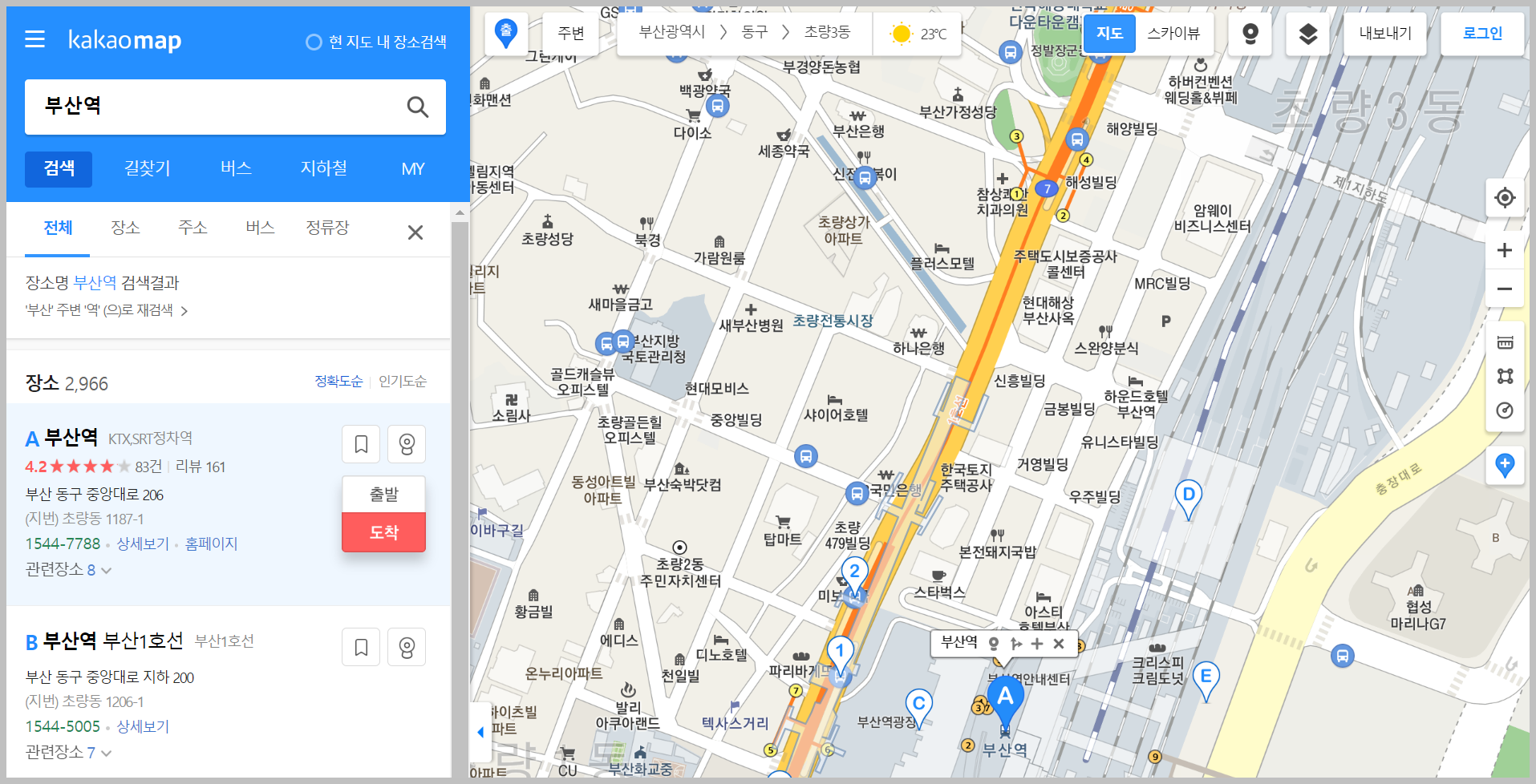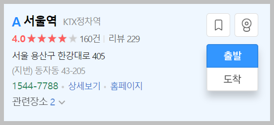 마찬가지로 부산역을 검색을 해 준다음에, 해당 장소에 마우스 오버를 하고 나서, 도착지로 결정을 해줍니다. 그러면 다음과 같이 화면이 전환이 됩니다.