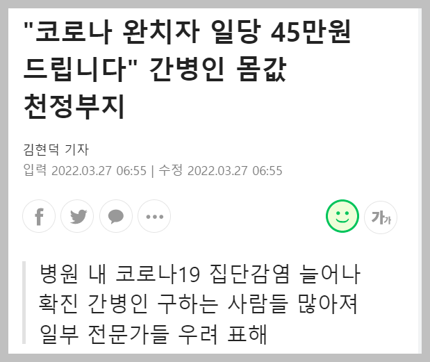 간병인 일당은 계속적으로 변화해 왔습니다. 코로나19가 한참 기승을 부렸을때는 간병인 일당이 천정부지로 솟았습니다. 특히 이미 확진을 받았던 ( 면역이 있는 ) 간병인의 가치는 많이 높아져서 일당 40만원 이상이 되는 경우도 있다고 뉴스에 나온적이 있을 정도 입니다.