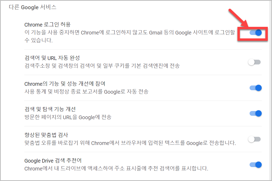 이중에서 'Chrome 로그인 허용'을 체크해제 하시면 gmail 자동 로그인이 중지가 됩니다. 앞으로는 gmail에 들어갈때마다 로그인을 해야합니다. 이는 장담점이 명확한것으로 무엇이 좋다고 이야기할수 없고 사람마다 스타일이 다르기때문에 적절하게 선택을 하시면 될것 같습니다.
