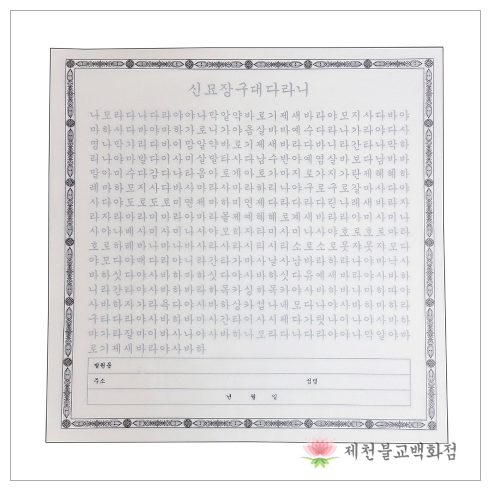 신묘장구 대다라니경 독경 (신묘장구 대다라니 21독, 108독 등)에 대한 것 입니다. 신묘장구대다라니는 우리나라 사찰에서 가장 널리 독송되는 다라니 가운데 하나입니다. 보통 천수경을 외울 때 중심이 되는 부분으로, 천수다라니나 대비주라고도 불립니다. 산스크리트어 이름은 닐라칸타 다라니이며, 관세음보살의 자비를 찬탄하고 그 힘에 의지하겠다는 뜻을 담고 있습니다. 다라니란 긴 주문을 의미하는데, 단순한 문장이 아니라 여러 의미를 압축해 담은 신성한 언어로 여겨집니다.